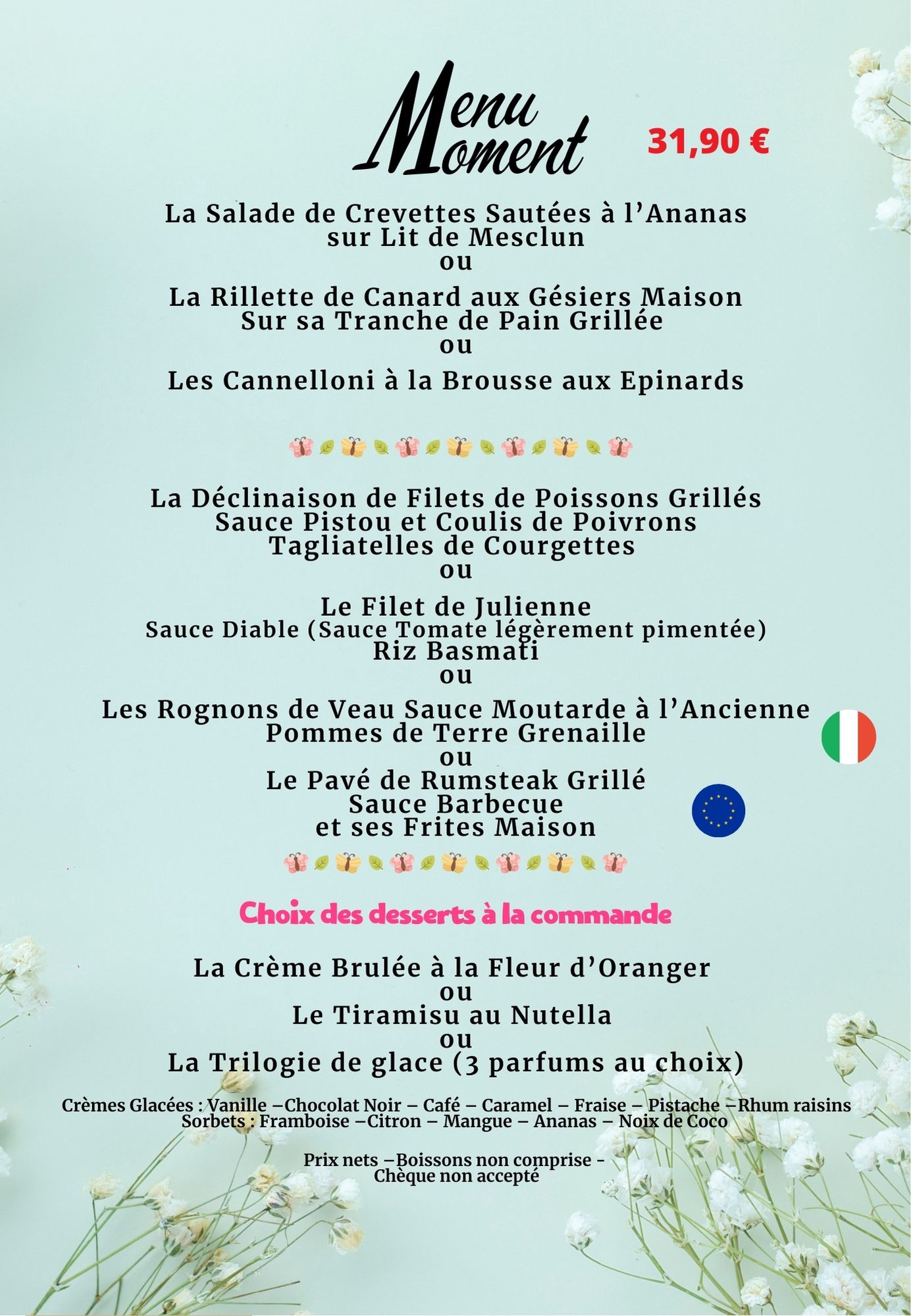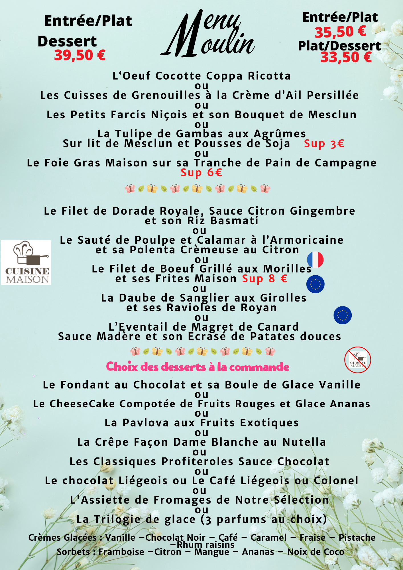 Afin que nous puissions toujours vous proposer un large choix de plats et de produits, nous faisons en sorte de travailler nos menus avec attention : nous cherchons avant tout à vous proposer des plats délicieux à la carte. Ainsi, notre chef et son équipe cherchent à vous cuisiner des recettes plus originales tout en restant authentiques