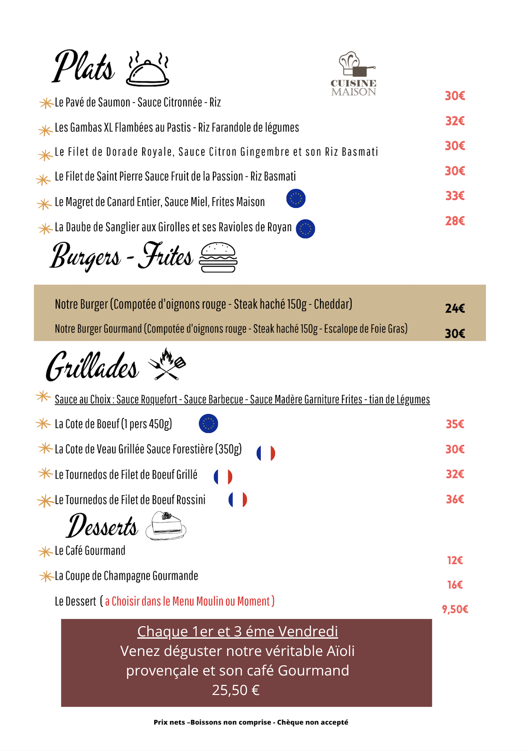 Nous vous conseillons ainsi de commencer par la carte de nos apéritifs qui permettra de vous donner un avant-goût des délicieuses saveurs provençales. Vous pourrez ensuite sélectionner l’un des plats à la carte et finir par un succulent dessert fait maison. En plus de nos cartes originales, nous proposons chaque 1er et 3e vendredi du mois notre aïoli provençal qui est très populaire. Vous aurez la possibilité de déguster ce plat en famille ou entre amis dans la salle du moulin du Sault qui a gardé sa décoration d’origine.